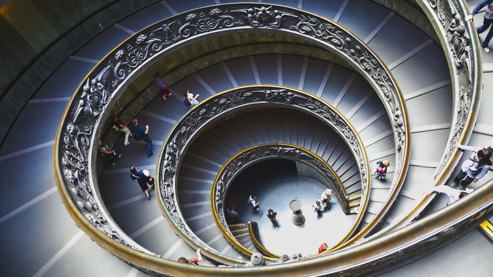 La Escalera de Bramante, en los Museos Vaticanos, es una escalera de doble hélice que permite subir y bajar en dos recorridos diferentes. (Gonzalo Azumendi / Getty)