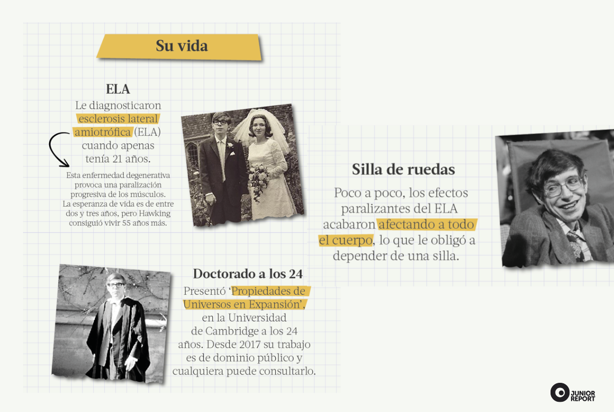 En 1963, cuando solo tenía 21 años, a Hawking le diagnosticaron esclerosis lateral amiotrófica (ELA), una enfermedad degenerativa que afecta a los músculos y el movimiento. Los médicos le dieron dos años de vida, pero el científico vivió medio siglo más: falleció cuando tenía 76 años.