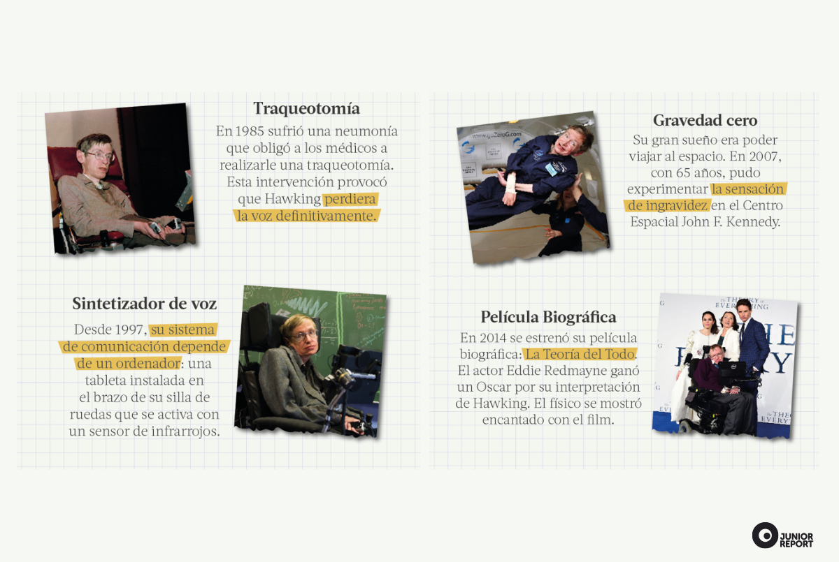 La enfermedad le obligó a desplazarse en silla de ruedas y al final de su vida no podía moverse ni tampoco hablar. Sin embargo, nada de eso impidió que siguiera trabajando en sus teorías. Hawking desarrolló un programa informático con un sintetizador de voz que le permitía hablar a través de un ordenador incorporado a su silla. Sus limitaciones físicas eran enormes, pero su capacidad intelectual no tenía límites.